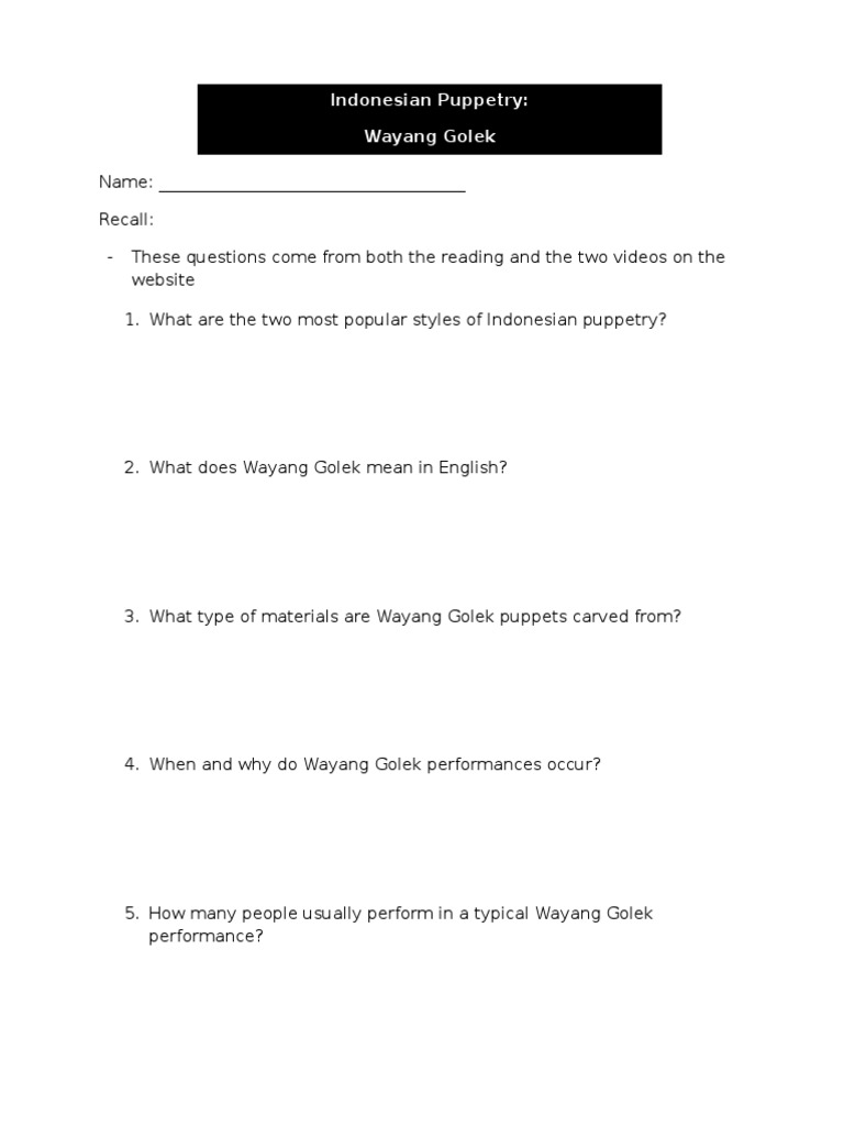 Wayang Kulit In The K 8 Art Studio With Anita Sagastegui from anitasagastegui.files.wordpress.com The performers may be hired by an individual or a family holding a life cycle ceremony, or by an entire village. Kulit means leather (as all shadow puppets are made out of animal hide) golek means rod (as the puppets are operated by wooden rods) therefore, wayang golek means rod puppets. Wayang golek's style and pattern are similar to that of wayang kulit's, except that wayang golek is not in 2d. Bandung has a few wayang golek theaters. Although tourist shops now sell imitations of wayang golek puppets, the puppets illustrated on these pages were actually used for many years in theater. Behind the cultural context and pageantry of the performance, the finest wayang golek rod puppets require detailed craftsmanship. The painted wooden puppets on the preceding page are old examples from the still thriving and important folk art puppet theater of java in indonesia. Unfortunately, this traditional art is only performed in certain theaters.